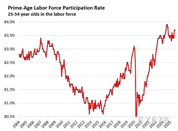 9月核心劳动年龄人口(25-54岁)劳动参与率维持在83.7%,与8月持平,处于历史高位。