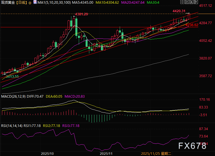 汇通财经APP讯——周一(12月22日)亚欧时段,现货黄金(XAU/USD)全天保持强势格局,在密集买盘推动下大幅刷新历史峰值,金价越过4400美元整数关口。